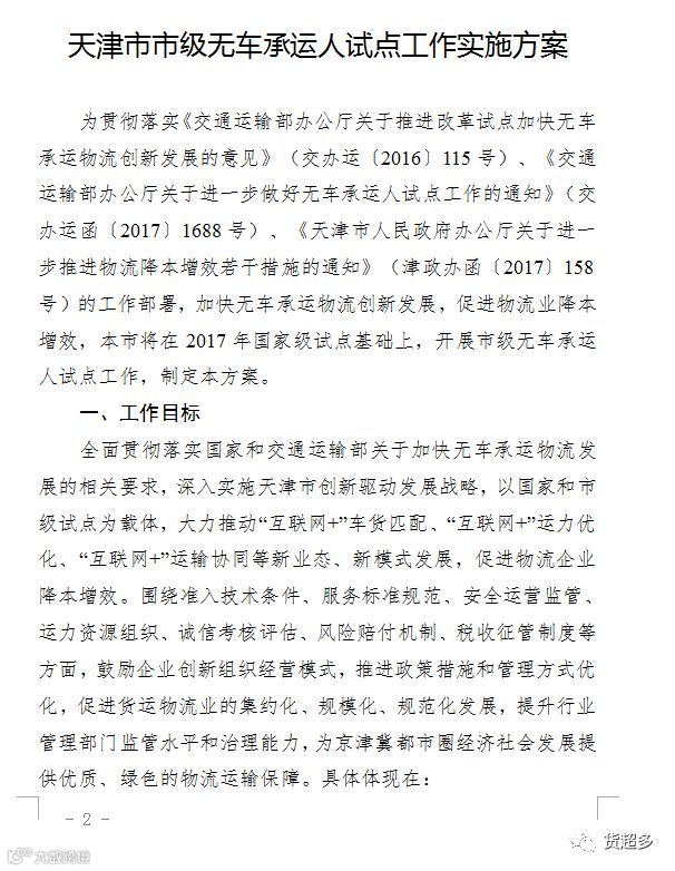 为贯彻落实《交通运输部办公厅关于推进改革试点加快无车承运物流创新发展的意见》(交办运〔2016〕115号)、《交通运输部办公厅关于进一步做好无车承运人试点工作的通知》(交办运函〔2017〕1688号)、《天津市人民政府办公厅关于进一步推进物流降本增效若干措施的通知》(津政办函〔2017〕158号)的工作部署,加快无车承运物流创新发展,促进物流业降本增效,本市将在2017年国家级试点基础上,开展市级无车承运人试点工作,制定本方案。