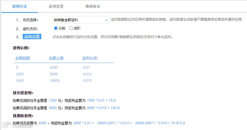返利方式:支持按销售金额或进货金额进行返利,且支持分段或进阶两种返利方式。当供应商在进货金额/销售金额达到指定任务时即可参与返利。