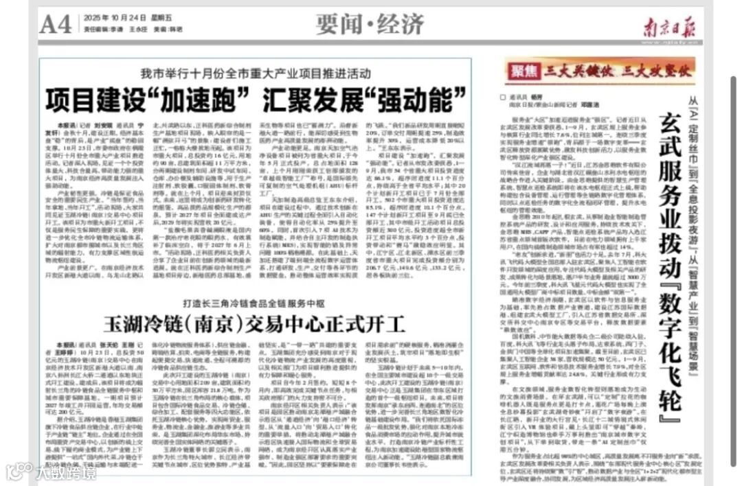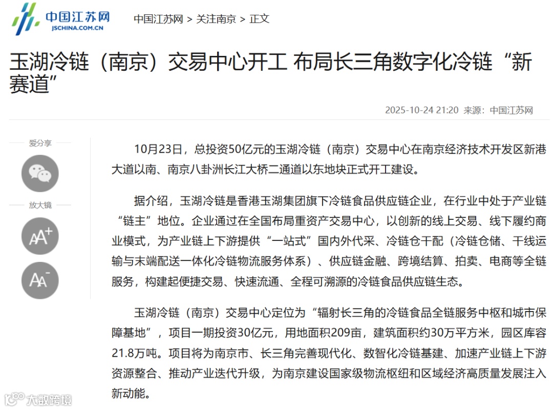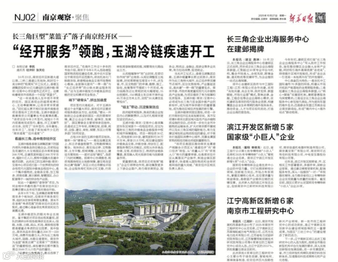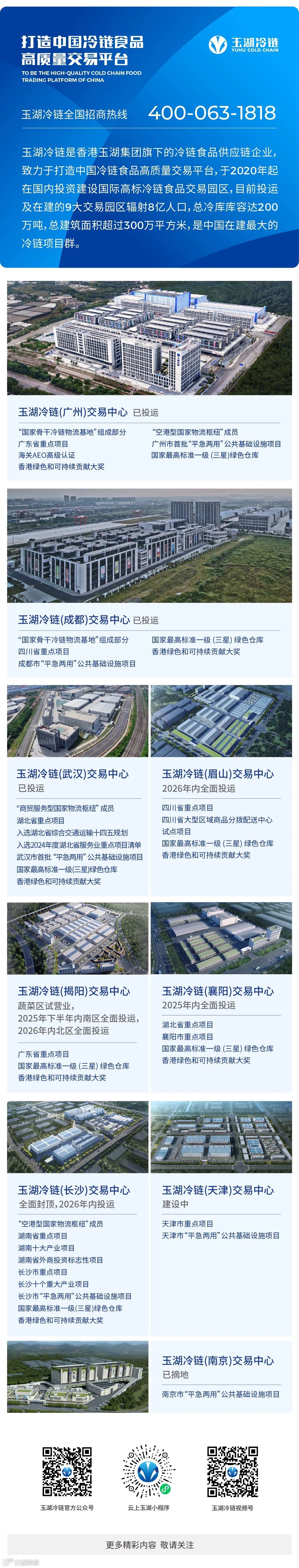 玉湖冷链(南京)交易中心定位为“辐射长三角的冷链食品全链服务中枢和城市保障基地”,项目一期投资30亿元,用地面积209亩,建筑面积约30万平方米,园区库容21.8万吨。项目将为南京市、长三角完善现代化、数智化冷链基建、加速产业链上下游资源整合、推动产业迭代升级,为南京建设国家级物流枢纽和区域经济高质量发展注入新动能。