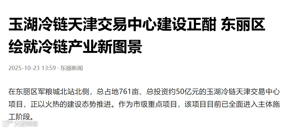 作为2024年国际航运产业博览会期间签约的重点项目,玉湖冷链(天津)交易中心是玉湖冷链在北方布局的首个一级交易中心,规划库容约30万吨。项目旨在打造集冷链物流、加工服务、贸易结算、智慧园区、办公配套于一体的综合性产业园。依托东丽区独特的地理优势,未来这里将成为覆盖华北、西北、东北“三北”地区的冷链食品流通枢纽。