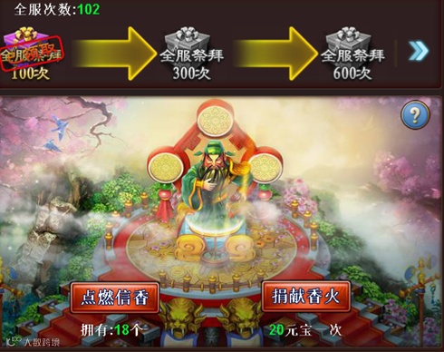 ◆仙友可以使用信香或者元宝进行祈祷,只要祈祷达到一定次数,全服所有玩家将会获得相应的礼包