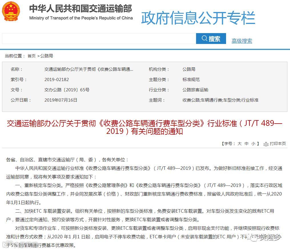 今年6月,交通运输部发布了新版《收费公路车辆通行费车型分类》(JT/T 489-2019),修改了货车的分类依据,同时指出2020年1月1日起,货车将按轴交纳车辆通行费。交通运输部指出,货车将按车型缴纳车辆通行费,进一步减少收费争议、便于收费管理。