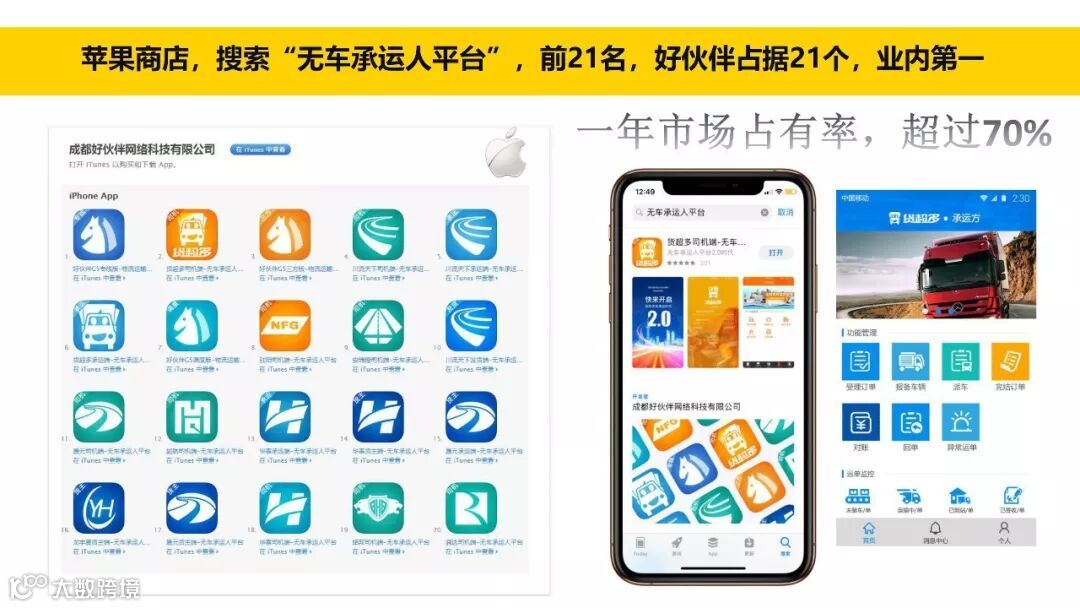 好伙伴,除了物流软件之外,还推出货超多品牌,研发出货超多司机端、货主端、承运端,apple store关于无车的app中排名第一,占据80%以上无车都是货超多开发的。无车承运人对于提高物流运输有着重要的意义,货超多也将帮助企业申报资质、部署平台,帮助企业通过无车获取税收优惠,通过物流金融获取更大的收益。