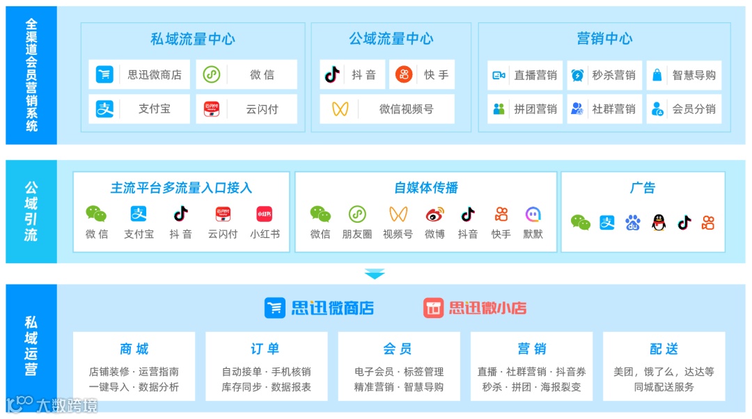 整合线上线下多渠道资源,搭建全链路会员体系,实现全域会员运营。聚合抖音、快手、美团等多个线上公域流量平台并配合短视频+直播、拼团、卡券营销等多种营销方案实现跨平台、多场景的营销覆盖,将公域流量引流到私域进行精准运营。