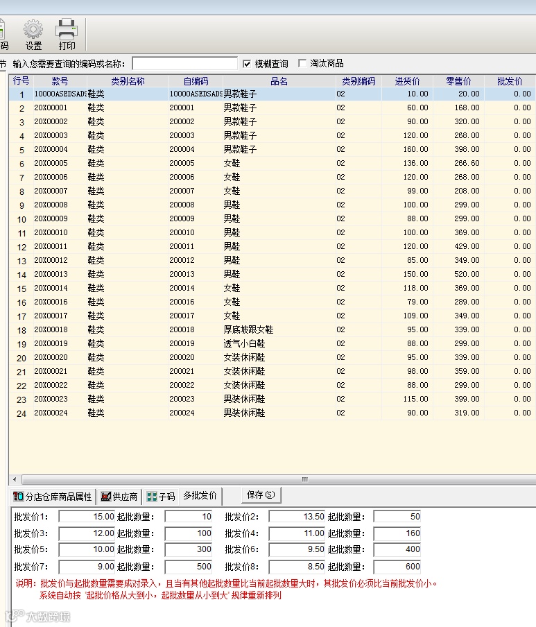 2、在商品档案中,选择任意商品,并填写多批发价。如图: