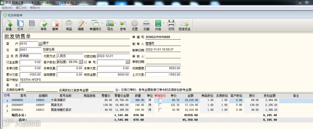 设置折扣比率后,当该客户批发购买任意商品时,都能享受到既定折扣。制作批发销售单如下图所示: