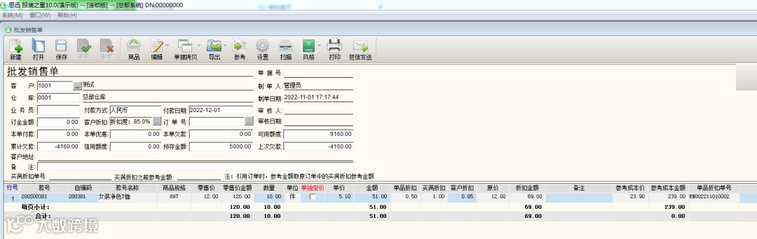 通过【默认价格】取价,商品取价金额为12元,如客户享受客户档案折扣0.85,还能享受【批发折扣促销单】的折扣0.5,以及批发单满额折扣促销,故而最终单价为 12*0.85*0.5*0.7=3.57。