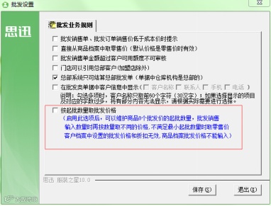 1、在批发管理——批发设置中先勾选“按起批数量取批发价格”,如图: