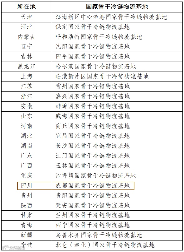 据成都日报报道,根据《「十四五」冷链物流发展规划》,国家骨干冷链物流基地是我国三级冷链物流节点的一级节点,承担产业引领、产地服务、城市服务、中转集散、口岸贸易等功能,成都作为西部大通道承载城市而入选。这也是继全国首批次多式联运示范工程、首批陆港型国家物流枢纽等后,成都再获物流方面的国家级称号。