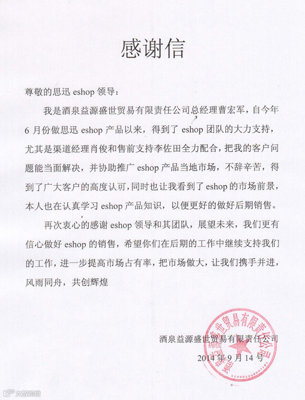 继上次潍坊华迅电子有限公司的感谢信之后,今天,eShop团队又收到了酒泉益源盛世贸易有限责任公司对eShop人员的公开表扬信。代理商除了感谢eShop团队对其大力支持以外还点名表扬了eShop的渠道经理与售前支持,由此不难看出代理商对eShop团队的高度认可,也让eShop团队对eShop的未来更加信心十足。另外酒泉益源盛世贸易有限责任公司至今年六月底的eShop进货金额已达到五万,在年底有望突破十万。