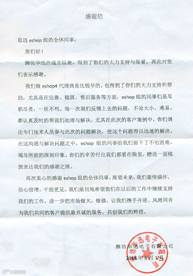 上封潍坊华迅电子有限公司感谢信内容如下: