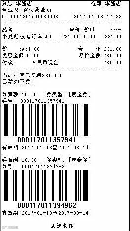 营业员将促销信息录入到系统后,优惠详情可随购物小票一起打印出来,每张小票就是一张相对应的优惠券,达到“券·票合一”的效果,也为商家节省了制券成本。