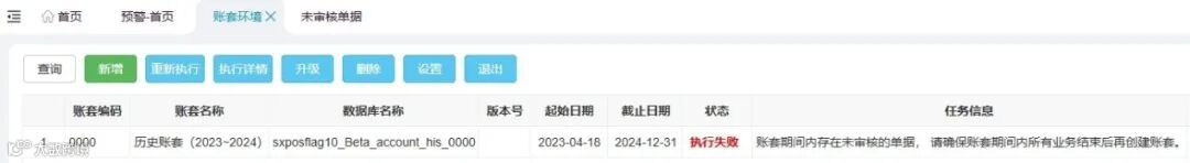 1. 账套期间如果存在未审核的单据,会导致账套执行失败,需处理后再重新执行。
