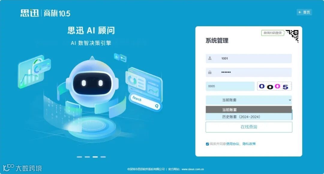 4. 后台登录时选择历史账套,则只能查看往年数据,不支持做单等业务操作;