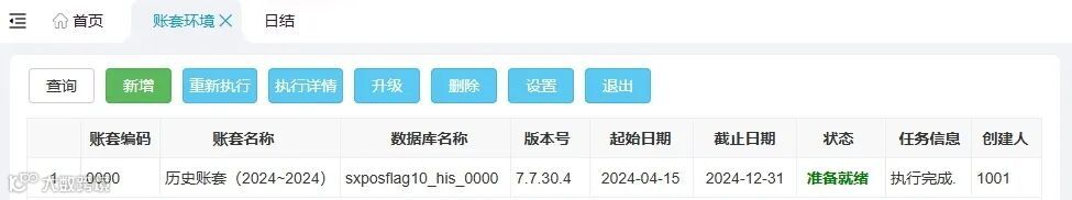 3. 账套执行完毕后会显示当前的版本号,后期账套数据库需要和软件数据库同步升级,以保证应用程序对历史账套的访问正常。