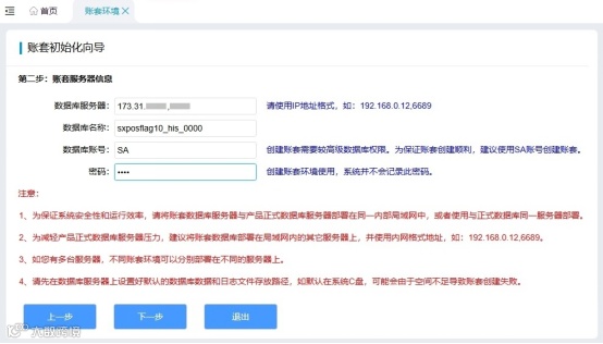 为保证系统安全性和运行效率,请将账套数据库服务器与产品正式数据库服务器部署在同一内部局域网中,或者使用与正式数据库同一服务器部署,使用IP地址格式填写数据库服务器地址。由于创建账套需要较高级数据库权限,请使用sa账号创建账套。