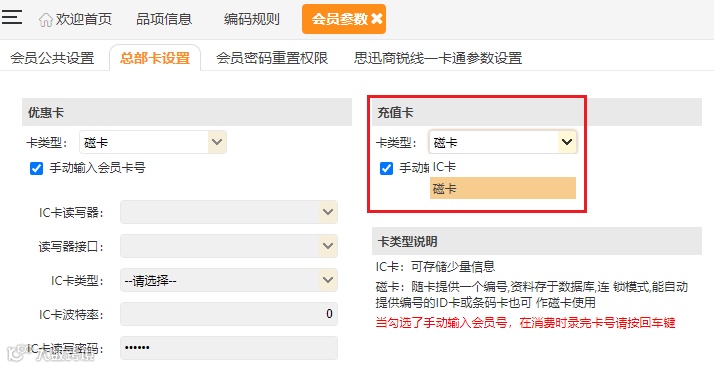充值卡的卡类型也支持手工修改,参数位置:汇食客总部系统--会员中心--参数设置--总部卡设置。
