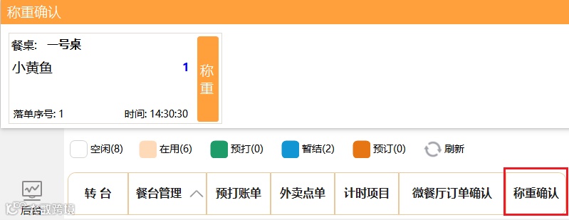 汇食客新版前台收银系统正餐模式--营业界面下方增加【称重确认】功能,支持开台点菜对未确认重量的称重菜品,可下单后对菜品称重完成再到营业界面进行【称重确认】处录入实际重量,不用再进入桌台找待称重产品,极大地提升了前台收银效率。