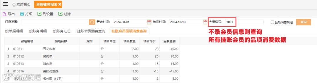 挂账会员品项消费后无法直接查询,商家无法掌握对挂账会员消费的品项情况。