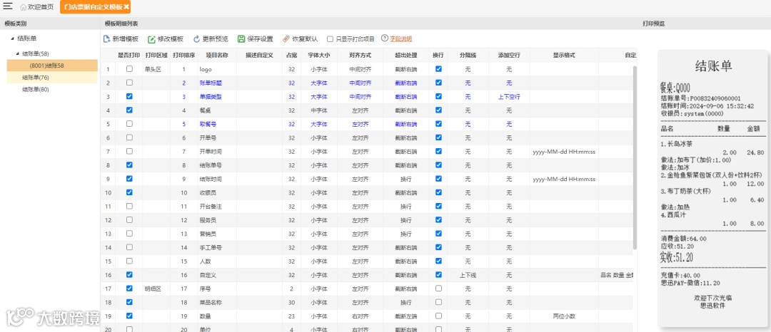 汇食客总部系统--营运管理--经营管理--新增【门店票据自定义模板】功能,支持对结账单在58、76、80纸张规格中自定义单据打印样式及字体大小等,界面右方为当前操作的模板打印效果预览,模板保存后前台收银系统下载数据后,再打开前台的设置--小票设置--自定义账单,启用自定义账单功能,选择总部系统设置的结账单打印模板,保存重新登录前台即可生效。