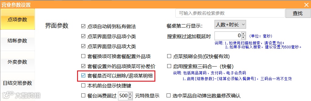汇食客前台收银系统设置--营业参数设置--点项参数,开启【套餐是否可以删除/退项某明细】,可在点餐时对于套餐内的明细进行删除或退项,让点餐更灵活,以满足不同顾客的用餐需求。