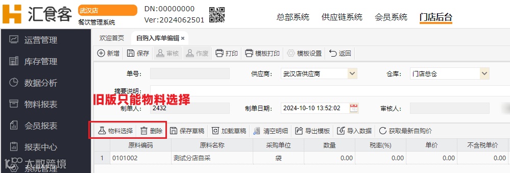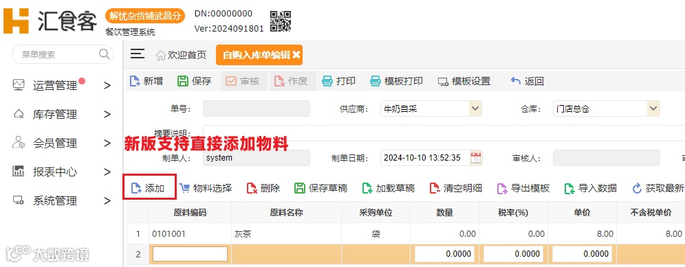 汇食客门店后台系统新版本支持在做自购入库和自购退货单界面直接添加需要的物料,让做单操作更便捷高效。