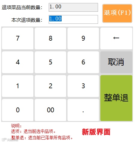 调整退项界面【整单退】和【确定】(退当前菜品的退项数量)参数位置,大大降低因惯性导致的误操作。