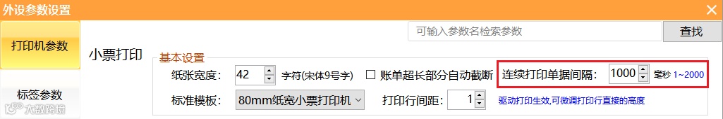 汇食客前台收银系统--设置--外设参数--打印机参数,支持对连续打印单据设置时间间隔(1~2000毫秒),可提高大量打印单据时的速率。