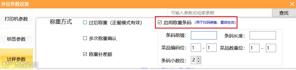 汇食客前台收银系统--设置--外设参数设置--计秤参数新增【启用称重条码功能】,对于已称重贴有称重条码的菜品,点餐界面直接扫码即可确认检索菜品并确认重量,提升收银效率。