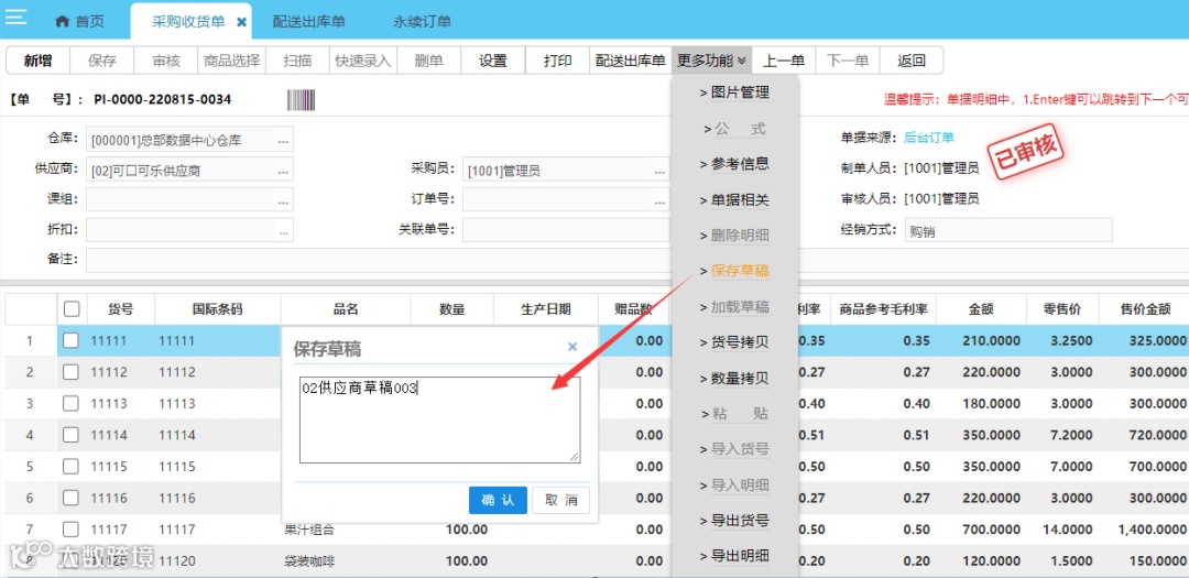 如果商家已经有单据明细的电子文档,可根据实际情况,在单据的“更多功能”中,选择是只导入商品货号,还是直接导入明细数据。