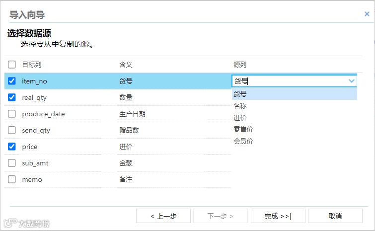 勾选需要导入的目标列,在源列的下拉框中选择对应的列,下拉框中的选项由所选源文件的列名来决定。