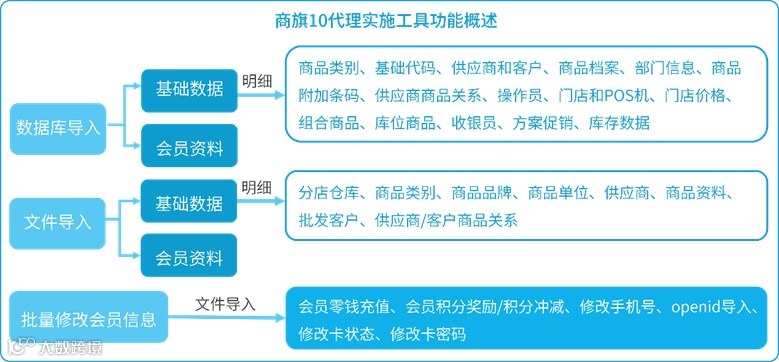 商旗10代理实施工具不仅可通过数据库导入资料,还可以支持文件导入。其中数据库导入已支持从商锐、商慧和商云系列产品的数据库中直接进行“一键导入”各类基础资料和会员信息。文件导入则不限制产品,通过文件整理后导入,也更加方便快捷!