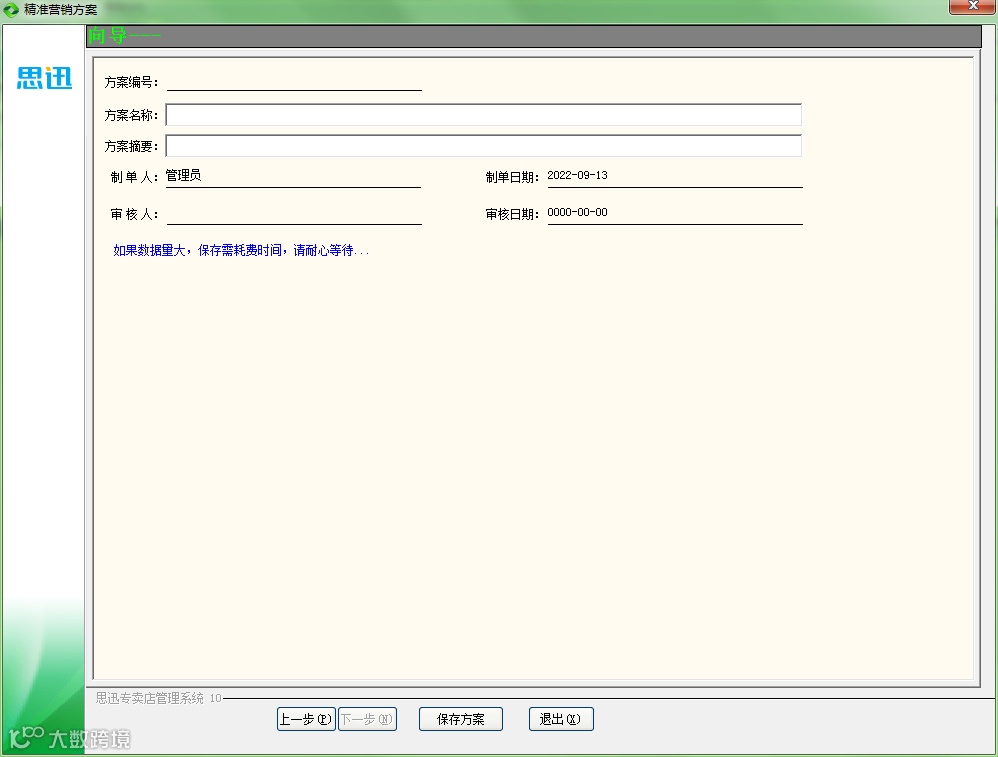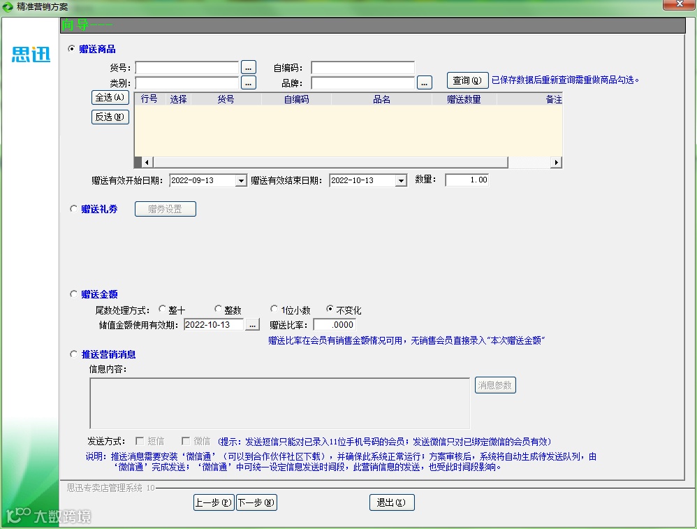 说明:新会员营销、活跃会员营销、生日会员营销、休眠会员营销点击下一步后,专卖10软件已预设参考值,可自行调整。而自定义营销设置界面显示为空,需要自行设置。
