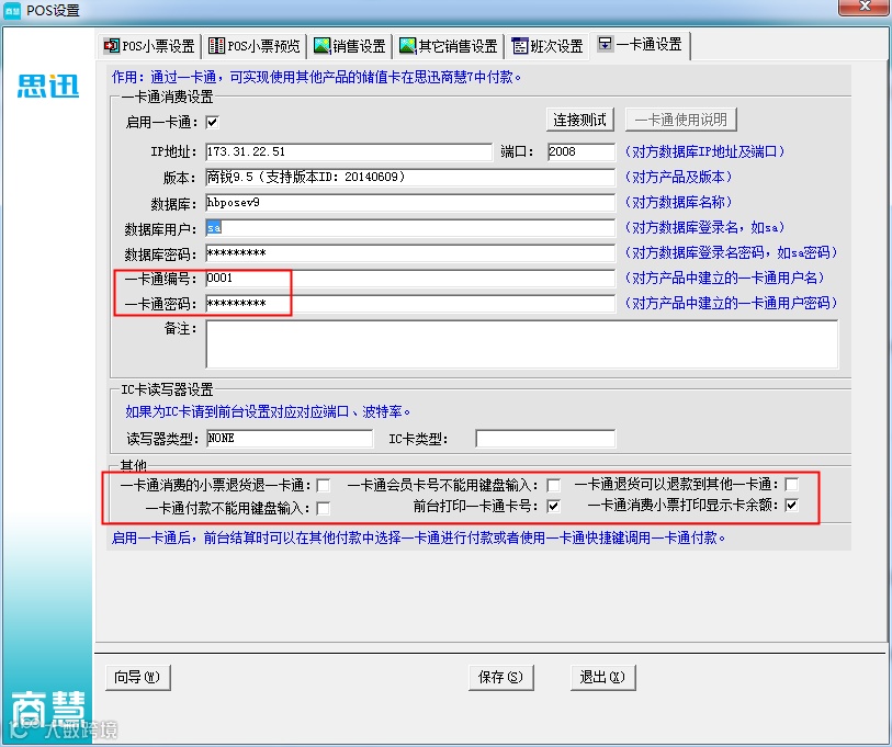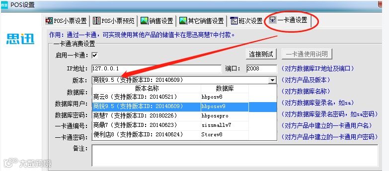 若是将以上产品做A店的情况下,对接的产品可在B店软件的“一卡通设置”中,“版本”中含有A店数据库信息即可。