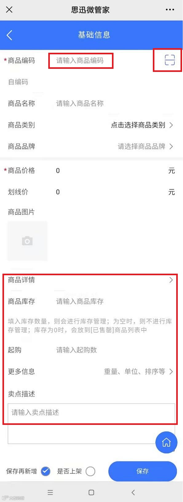 【上传商品图片】:输入商品编号或点击“扫一扫”检索已存在的商品基础信息。