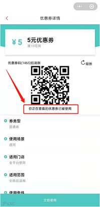 顾客再次打开微商店小程序端的优惠券,会显示“你正在查看的优惠券已使用”,此优惠券不能再次使用。