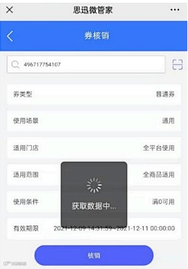 商家进入微管家——券核销,选择“扫一扫”,或手动输入动态券码,系统会自动获取优惠券信息,点击“核销”按钮后,提示“成功”则表示券已经核销完成。