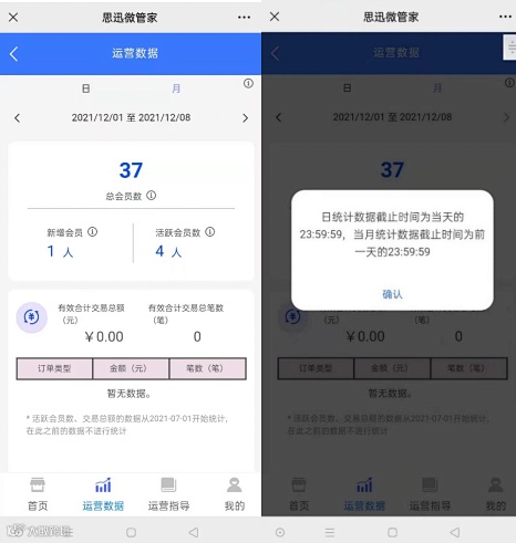 可查看昨日、今日、本周、本月交易数据。包含已支付金额(包含未成团金额),已支付订单数,充值金额,新注册会员数。