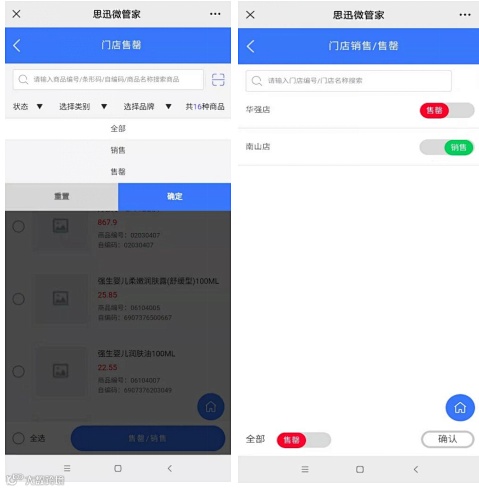 【门店销售】:可将商品状态选择为“销售”或“停售”状态,并查询商品。