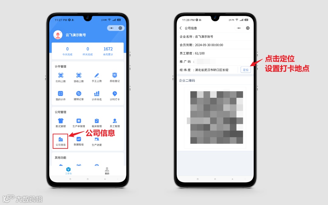 ②管理员在手机端点击公司信息,设置打卡地点,打卡范围为该地点300米