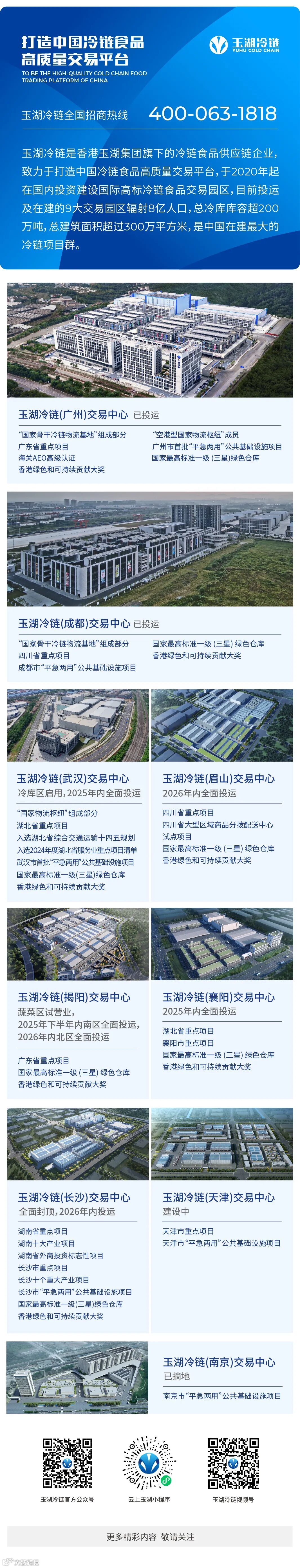 6月,国家发展改革委公布第五批国家骨干冷链物流基地建设名单,玉湖冷链(广州)交易中心作为广州国家骨干物流基地重要组成部分入选。继2022年成都项目入选“成都国家骨干冷链物流基地”、2023年广州项目入选“广州空港型国家物流枢纽项目”、2024年武汉项目入选“武汉商贸服务型国家物流枢纽”,至此玉湖冷链已获得四个国家级的冷链和物流体系认证。