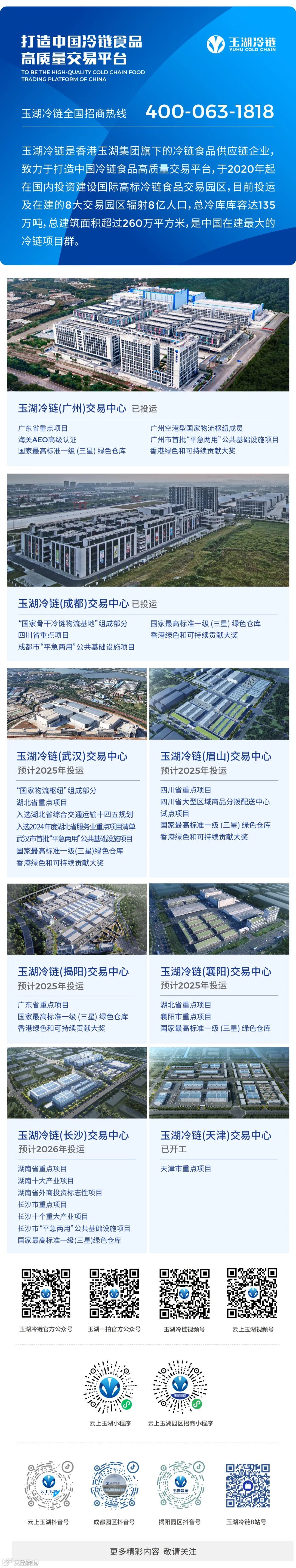 目前,玉湖冷链已在全国核心城市布局数字化冷链交易中心,投运及在建项目总建筑面积超260万平方米,总库容超135万吨,构建起覆盖全国的数字化食材供应链网络。