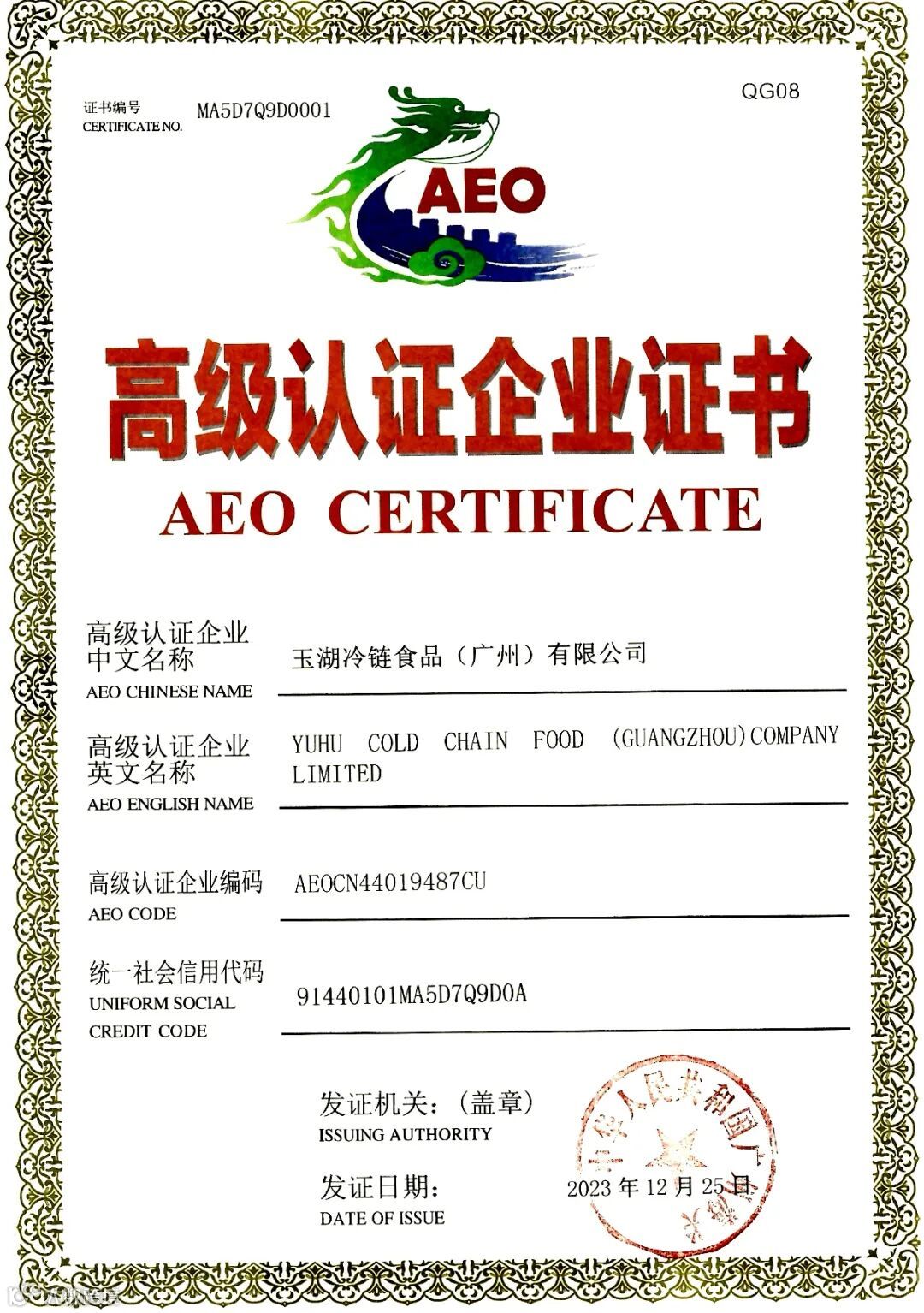日前,玉湖冷链成功通过了中国海关企业信用的最高等级——AEO高级认证,获颁「AEO高级认证企业证书」。这标志着海关对玉湖基于自身业务规范管理构建的贸易合规体系给予了高度认可。这一认证也是企业享受通关便利的重要条件,将为玉湖冷链服务进出口贸易、实现全球冷链食品从源头到国内餐桌的快速通达,提供实质性保障。