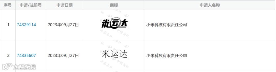 2018年,小米层尝试通过信息服务的方式切入快递行业,模式类似菜鸟,经过4年多的运营,小米基本放弃该业务。不过在10月从国家知识产权局商标局网站获悉,小米科技有限责任公司申请注册了两枚“米运达”商标,国际分类分别为39(运输贮藏)和12(运输工具)。