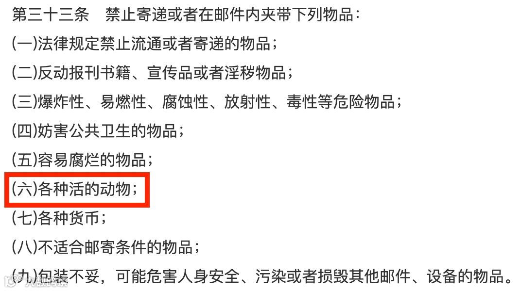 其实,活体寄递在我国有着很严格的管控系统,《中华人民共和国邮政法实施细则》的第三十三条明文规定,禁止寄递或邮件内夹带各种活的动物。