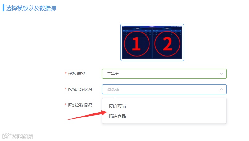4.投屏方案有9个模板,每选择一个模板,都有对应的展示数据列。例如:选择二等分模板后,可选择其对应的特价商品或畅销商品数据。