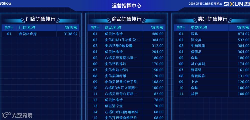 门店/类别/商品销售额及排行情况,实时查看区域门店数据,及时作出业务调整。