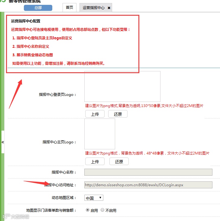 1. 打开【系统】—【运营指挥中心】模块,设置相关显示配置;图片中网址仅供参考,实际网址根据客户服务器上安装显示为准。