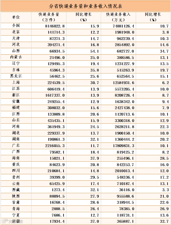 1-8月,邮政行业业务收入(不包括邮政储蓄银行直接营业收入)累计完成9708.5亿元,同比增长10.4%。其中,快递业务收入累计完成7488.1亿元,同比增长10.7%。