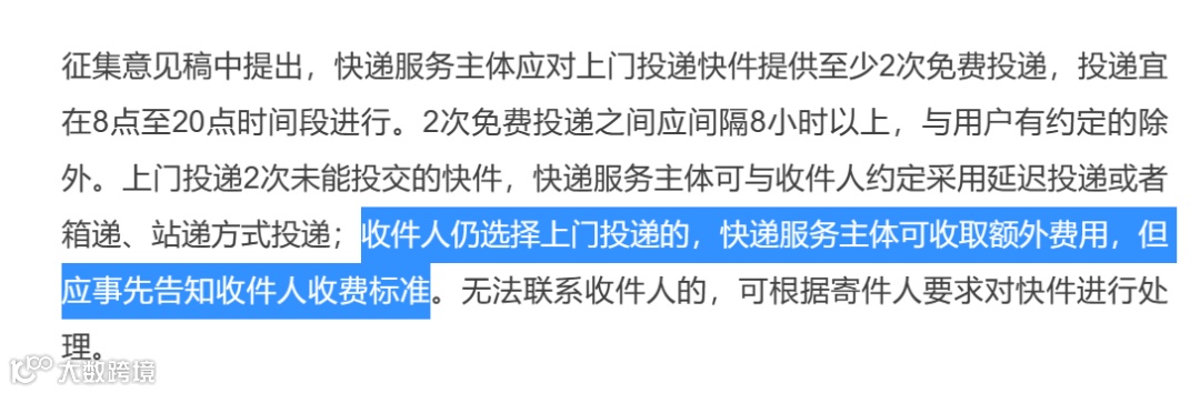 上门进行两次配送,是会极大的降低快递员的工作效率,但第三次投递可额外收费又旨在保护快递员的劳动权益,均衡快递员在以消费者为首要目标时而付诸的时间成本与精力,看似是“劳有所得”的一种体现。快递员表示:“目前来看的话,两次派送不成功,要做问题件,工作量会变很多,第三次派送,客户都会选择驿站存取,不愿意接受额外收费。”